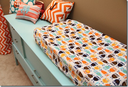 The dresser will also serve as a changing table, so Kent sewed this precious owl changing pad cover that matches perfectly.