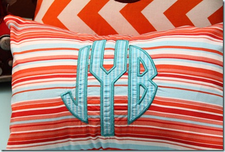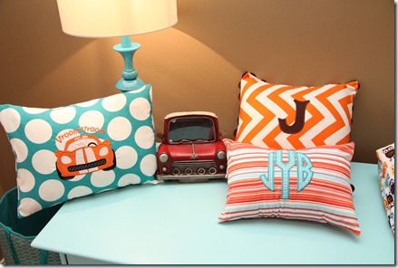 Kent also made all of these pillow covers out of coordinating fabrics. (By the way–Natalie spraypainted an old black lamp a beautiful aqua color and it looks awesome on his dresser!)