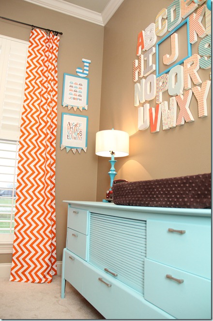 That nursery is incredible! I’m loving oranges right now, and it looks fabulous with the aqua blue!