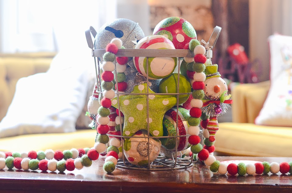 The centerpiece on the dining room table is my lazy susan from Create-ologie and those shiny brights have multiplied over the years! I have intentions to make a wreath out of them, but for now I will enjoy them on the table.