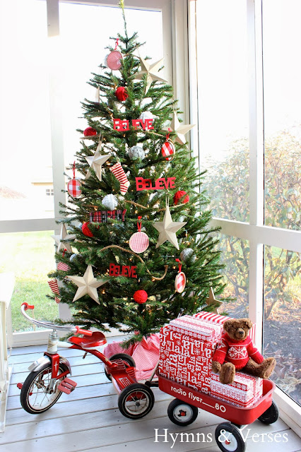 The tree is decorated with wood stars, a rope garland, yarn balls, and small embroidery hoops with red and white checked fabric. The “believe” and “merry” cut outs and red and white striped stockings were just $1 each!