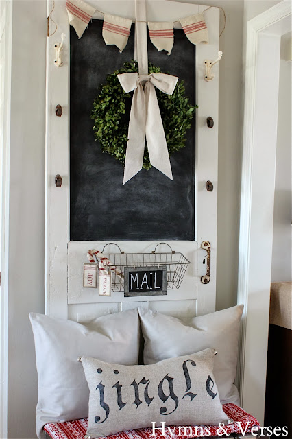 This fall I turned an old door into a family message center with a chalkboard, hooks to hang hats, scarves and keys, and mail basket. Here it is dressed up for the holidays.