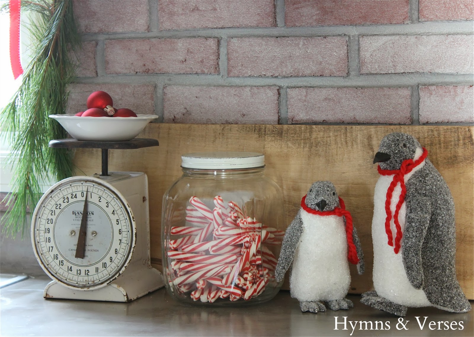 Here’s a fun little vignette on the countertop. Â The sparkly penguins got red scarves this year!